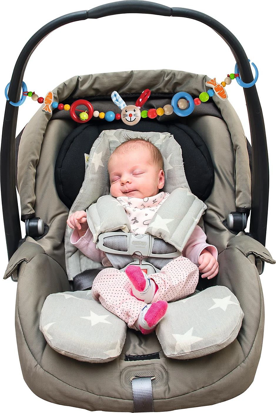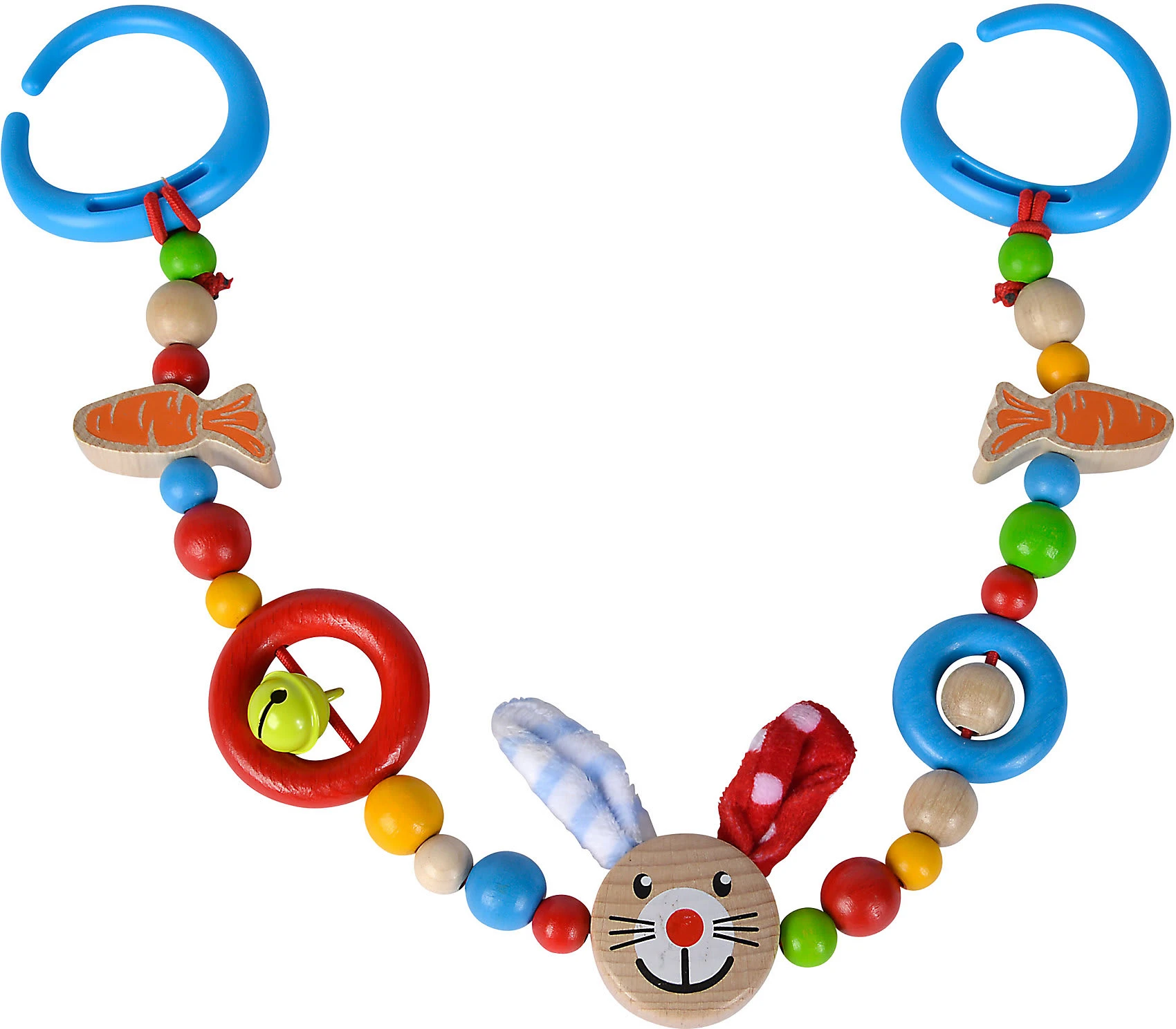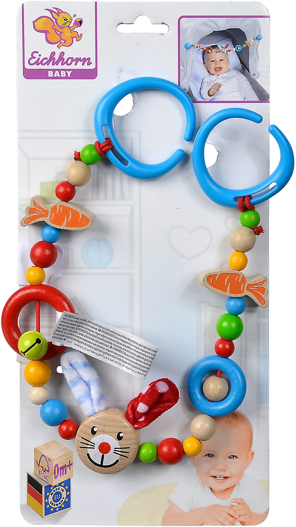 Sorgt für strahlende Baby-Augen: Dank der farbenfrohen Kinderwagenkette von Eichhorn gibt es selbst für die Kleinsten unterwegs viel zu sehen. Kinderwagenkette von Eichhorn mit Hasen-Motiv aus Buchenholz (FSC® zertifiziert), Plüsch und Kunststoff Made in Germany ab Geburt geeignet Mit seinen verschiedenen Formen und Farben bereitet die Kinderwagenkette Deinem Kind viel Freude. Zu erkunden gibt es bunte Holzperlen und einen süßen Hasenkopf mit Plüschohren in der Mitte der Kette. Dank der Kunststoff Clips an beiden Enden lässt sich die Wagenkette aus Holz ganz einfach befestigen. Du kannst also nach Belieben entscheiden: Soll die Kette für weniger Ablenkung weiter oben hängen – oder weiter unten, damit sie Dein Kleines genauer betrachten kann? Für Beschäftigung im Kinderwagen ist also gesorgt und dem nächsten Spaziergang steht nichts mehr im Wege.