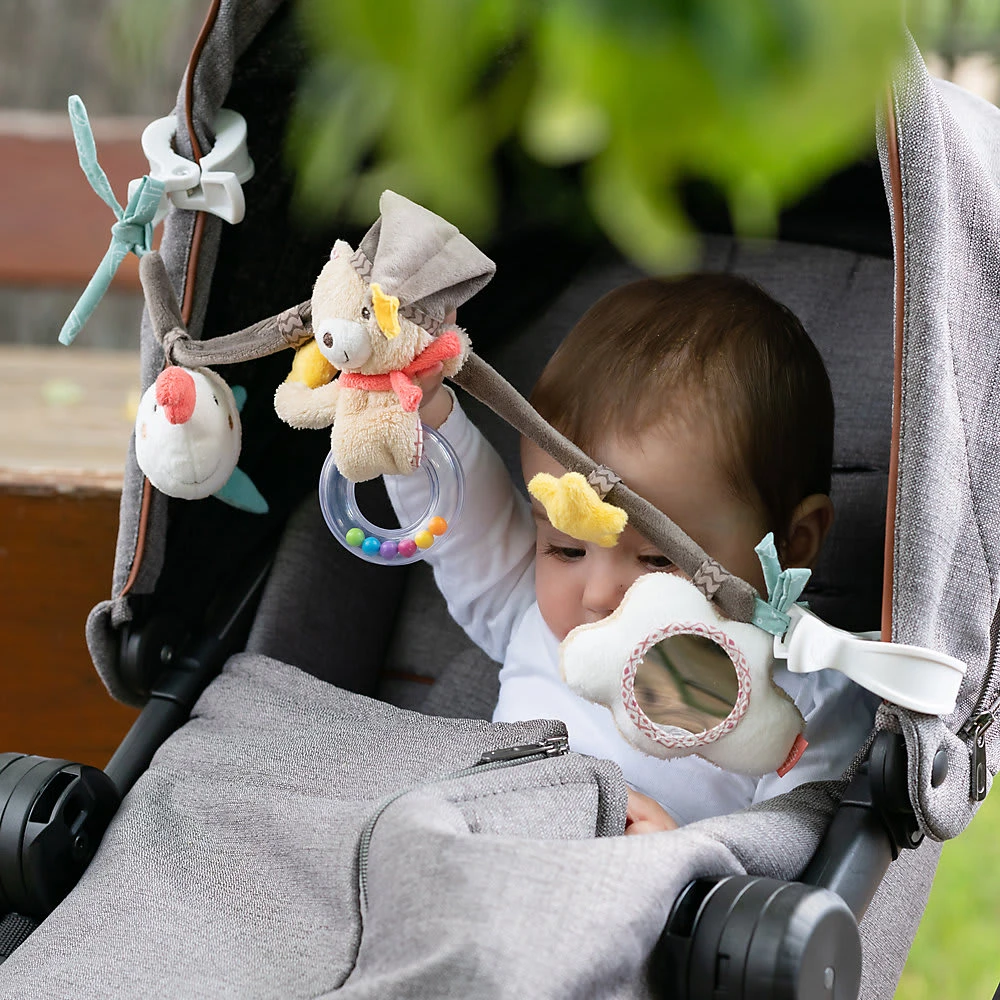 Die Fehn Kinderwagenkette Bruno hält Babys mit den niedlichen Anhängern immer bei guter Laune! Die Quietsche im Sägefisch, der lring am Bären und der Spiegel in der Wolke laden zum Greifen und Fühlen ein, fördern erste Hand-Auge-Koordination und unterstützen spielerisch die Ich-Wahrnehmung. Die Kette kann schnell und flexibel an Kinderwagen, Babyschale, Bettchen, Wiege oder Spielebogen angebracht werden. Sie sorgt für einen einzigartigen Spielspaß, egal ob zuhause oder unterwegs.