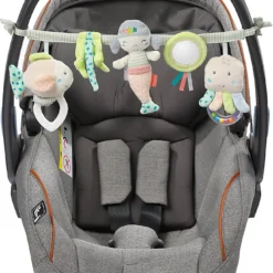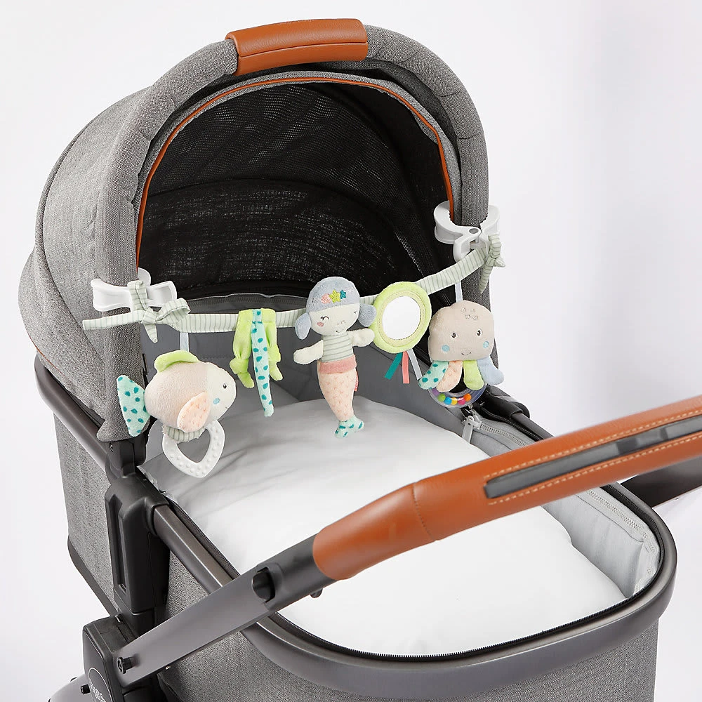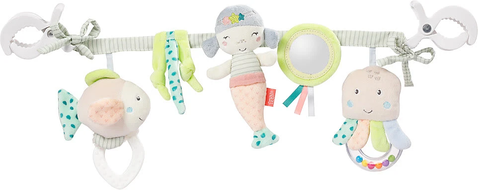 Die Kinderwagenkette “Meereskinder” der Marke Fehn kann beispielsweise am Bettchen oder am Kinderwagen befestigt werden und ist so ein spannendes Spielzeug für unterwegs sowie für daheim. Die verschiedenen Spielzeuge laden zum Entdecken und Fühlen mit allen Sinnen ein. Dabei trainieren Babys außerdem die Motorik sowie die Hand-Auge-Koordination.