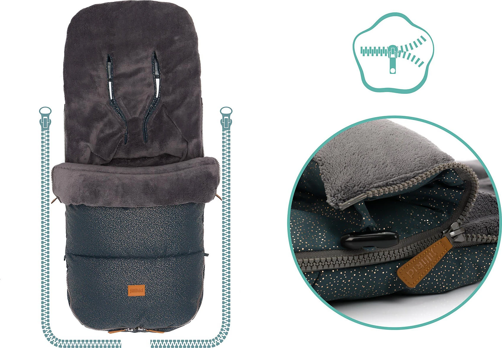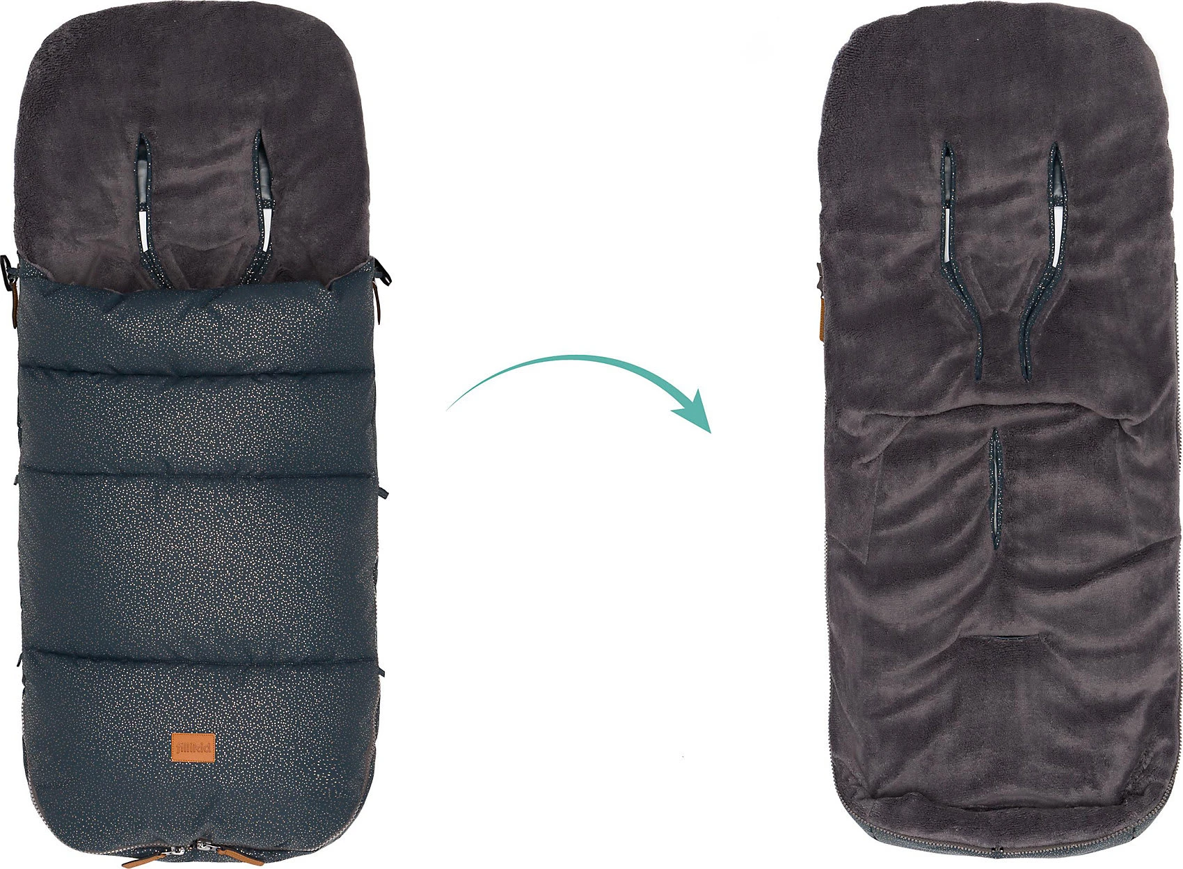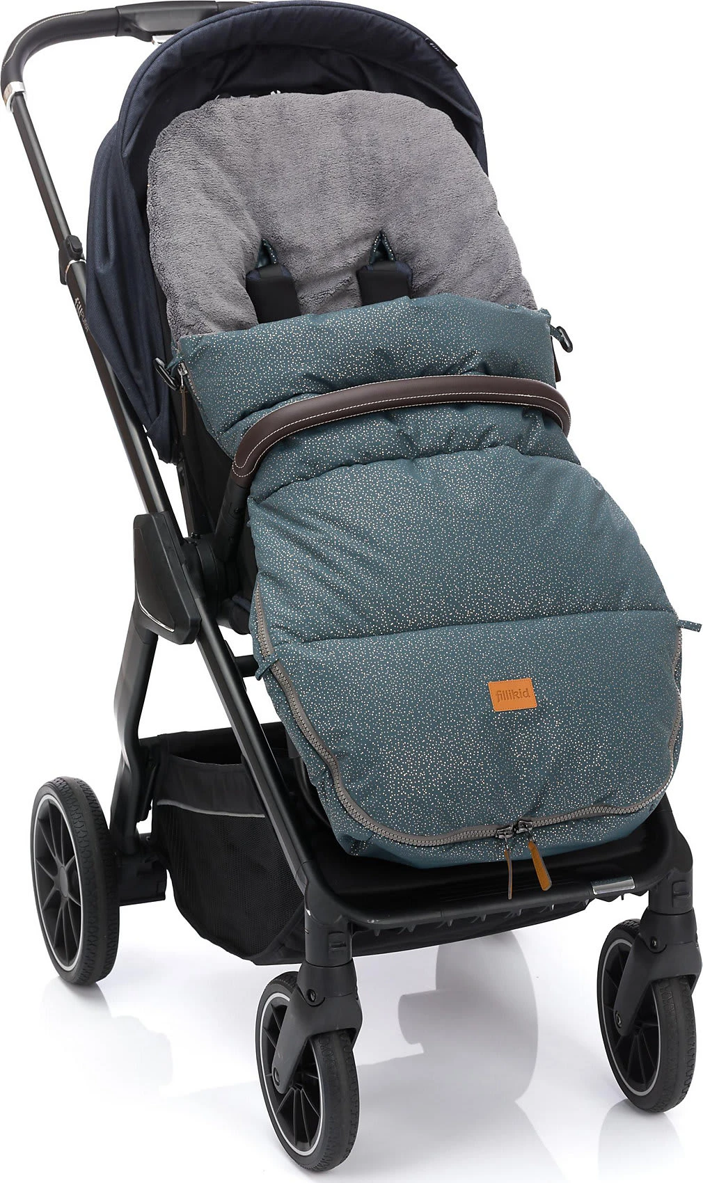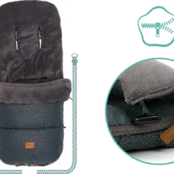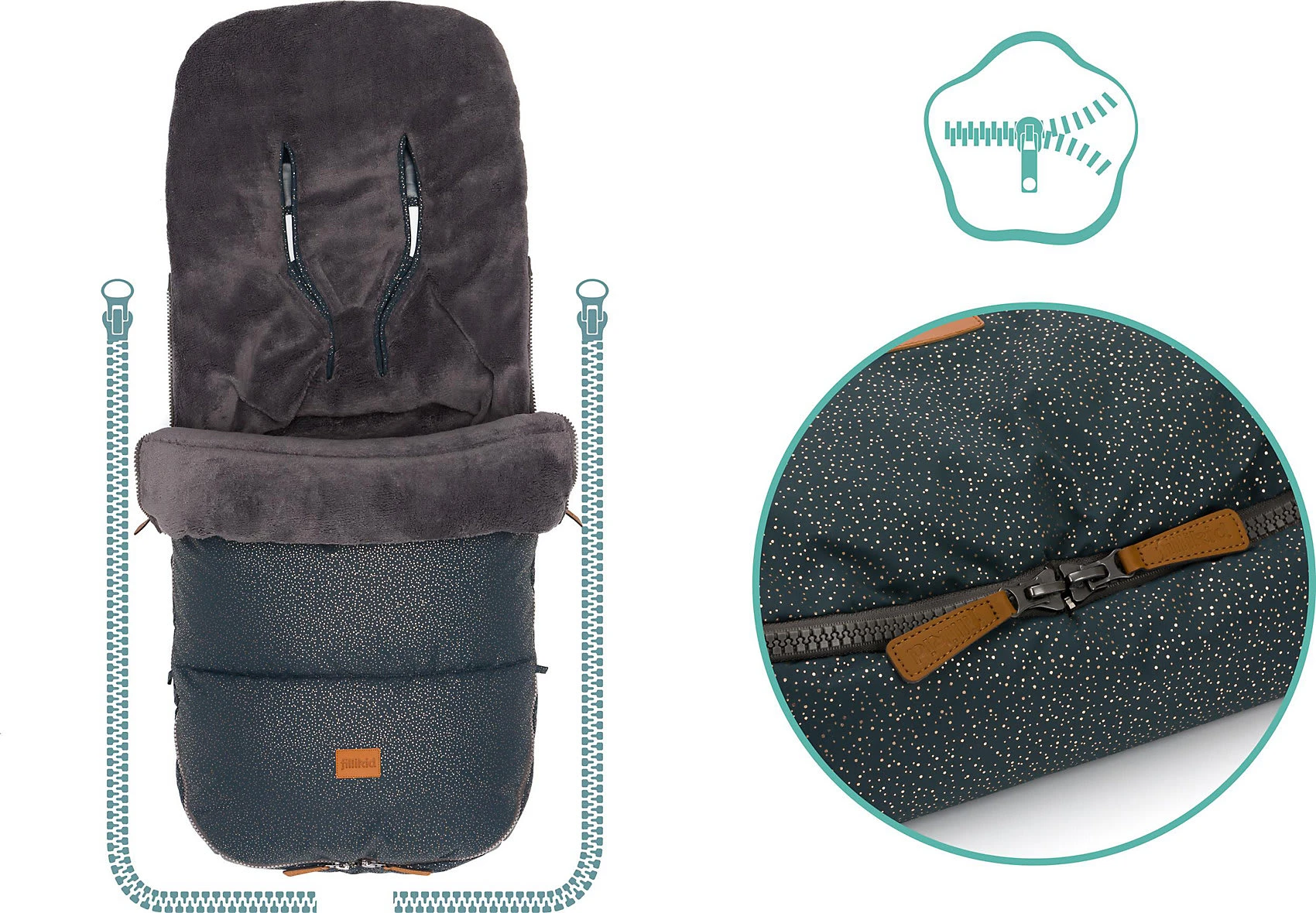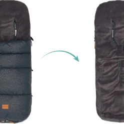 Der FILLIKID Winterfußsack „Kinley“ besitzt ein wasserabweisendes Obermaterial. Das Innenmaterial aus weichem Coral Fleece ist mit einem Schmutz-Schutz ausgestattet. An kalten Tagen funktioniert er als wärmender Fußsack, an wärmeren als gemütliche Sitzauflage. das Vorderteil lässt sich nämlich per Zweiweg-Reißverschluss entfernen.