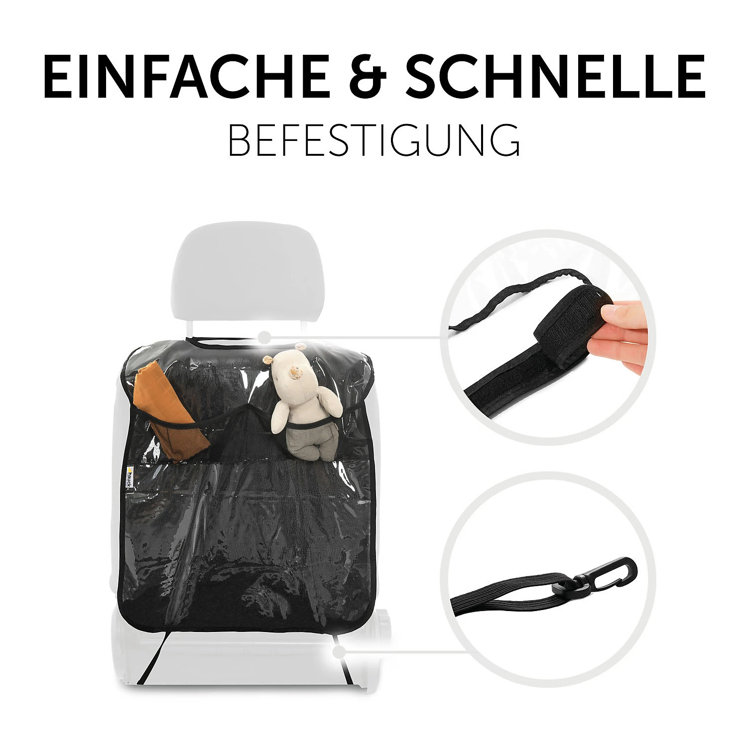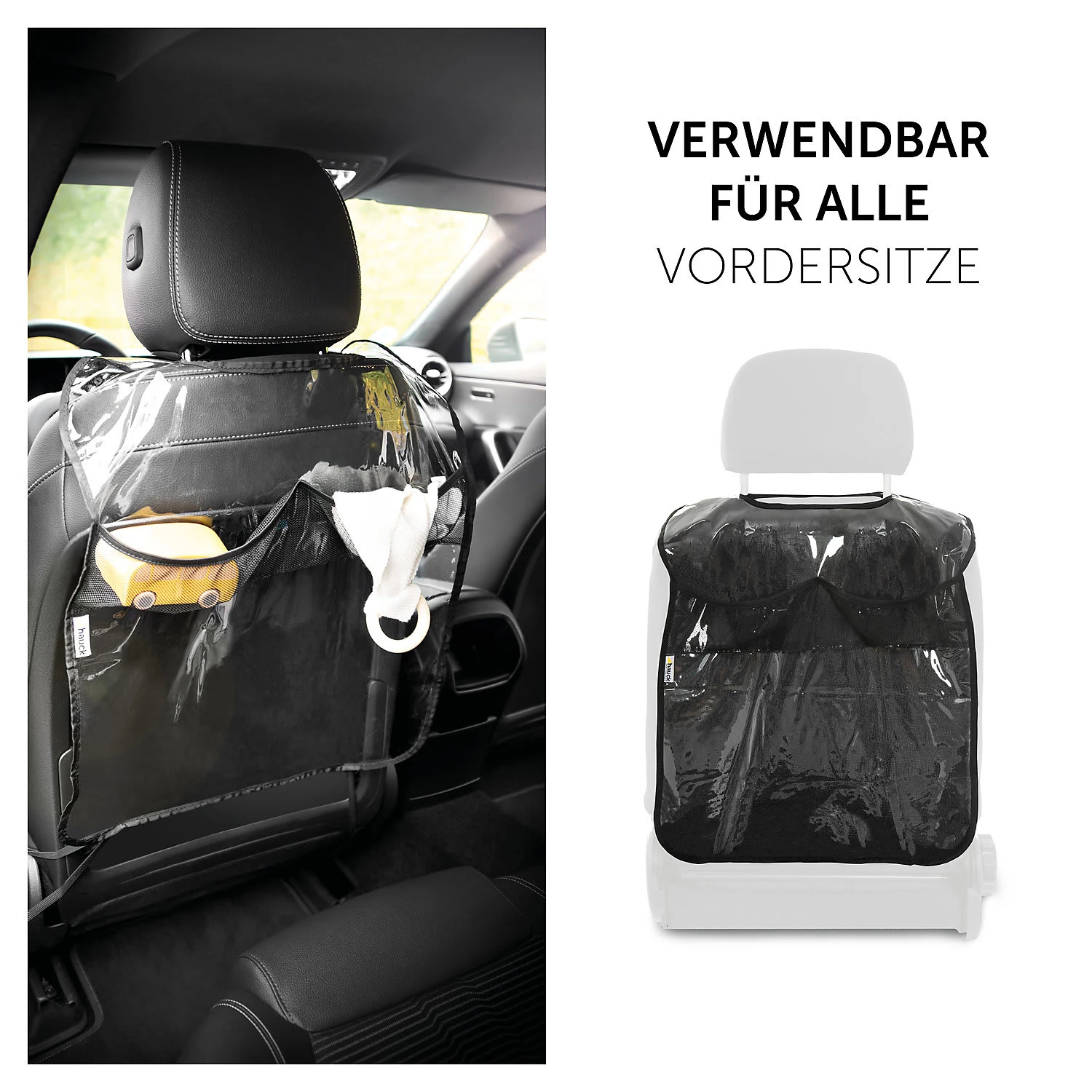 Der Auto-Rückenlehnenschutz von Hauck schützt nicht nur die Rückenlehne vor Schmutz und Kratzern. Zusätzlich bietet der einfach zu befestigende Rückenlehnenschutz eine Netztasche zur Aufbewahrung von kleinen Dingen, die unterwegs benötigt werden. Das hochwertige, UV-beständige Material ist reißfest und abwaschbar.