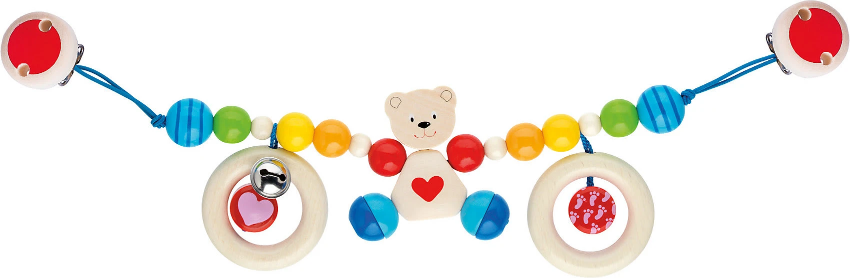 Die zuckersüße Kinderwagenkette „Herzbär“ von HEIMESS ist mit zwei praktischen Clips ausgestattet, die das Anbringen erleichtern. Das Modell zeigt sich mit kunterbunten Perlen, einem niedlichen Bären sowie zwei Ringen, die zum Greifen und Spielen einladen. Damit werden spielerisch die Sinne des Babys gefördert. Besonders toll ist auch das Glöckchen, mit dem akustische Reize gefördert werden.