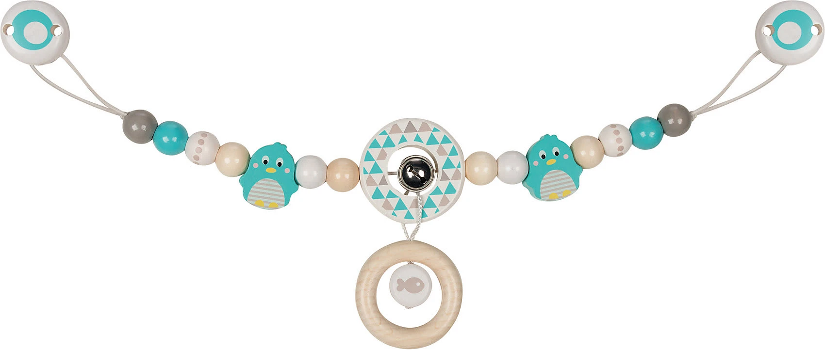 Klingeling! Diese bunte Kette sieht nicht nur toll am Kinderwagen aus, sondern bietet dem Baby unterwegs auch eine tolle Möglichkeit zum Spielen. Die zwei süßen Pinguine bieten dabei visuelle Anreize, wohingegen das kleine Glöckchen in der Mitte akustische Anreize auslöst. Dank der zwei Clips ist die Kette blitzschnell am Kinderwagen befestigt. Das lackierte Holz bietet langfristigen Spielspaß und sieht einfach toll aus.