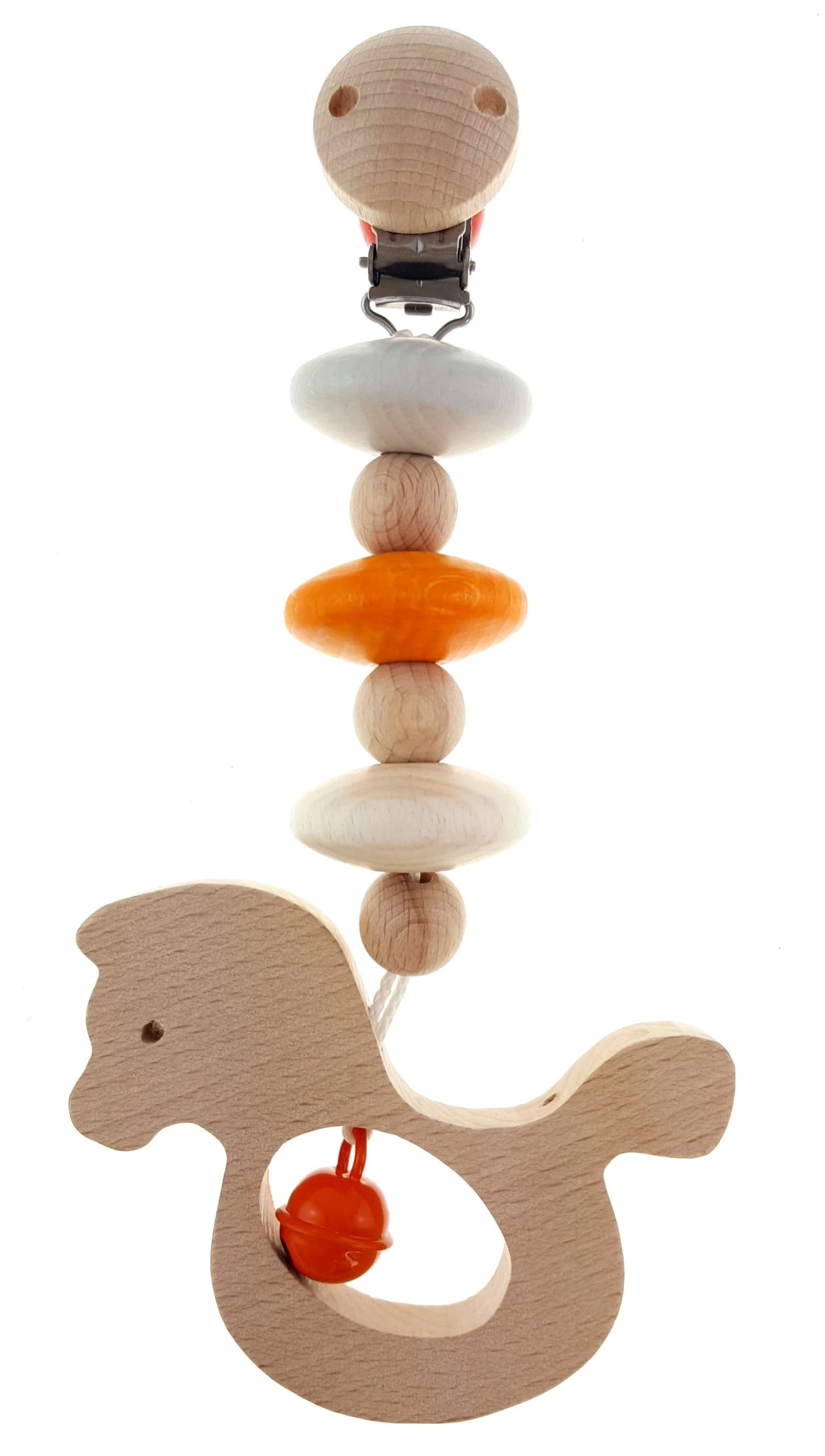 schöner farbenfroher Wagenhänger aus Holzelementen mit Clip zum Befestigen an Kinderwagen, Bettchen oder Kleidung
