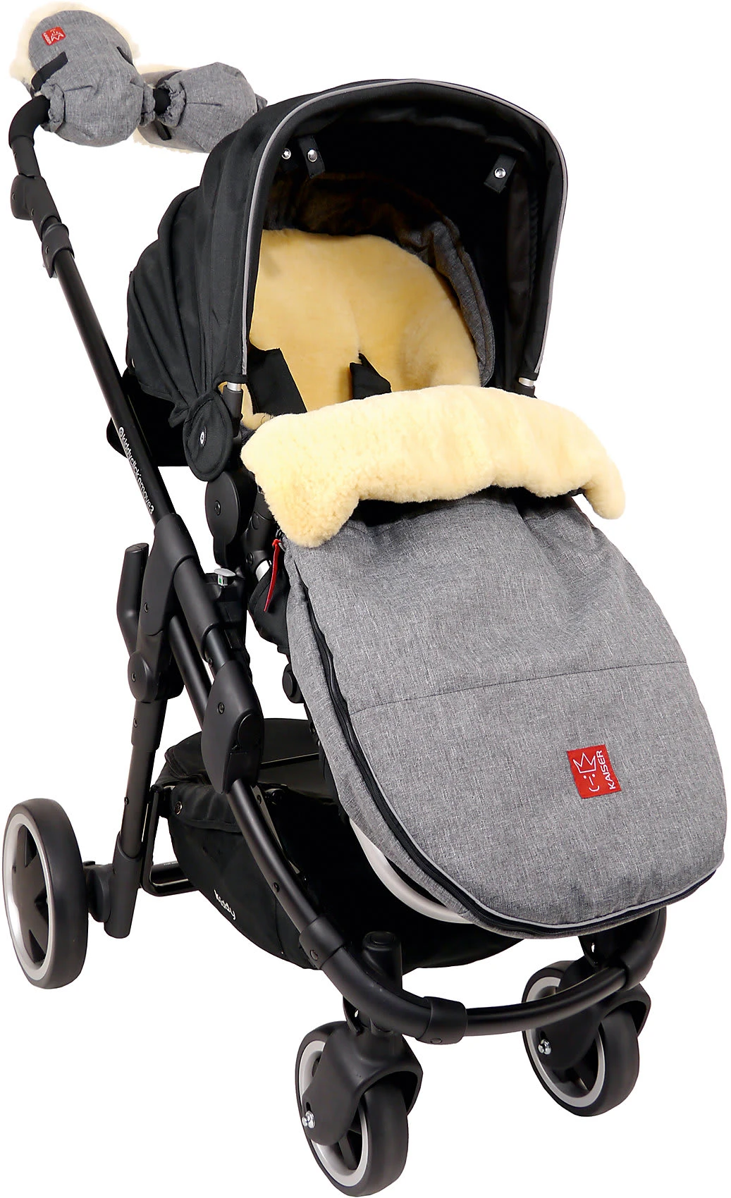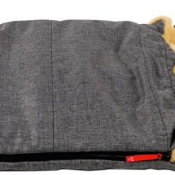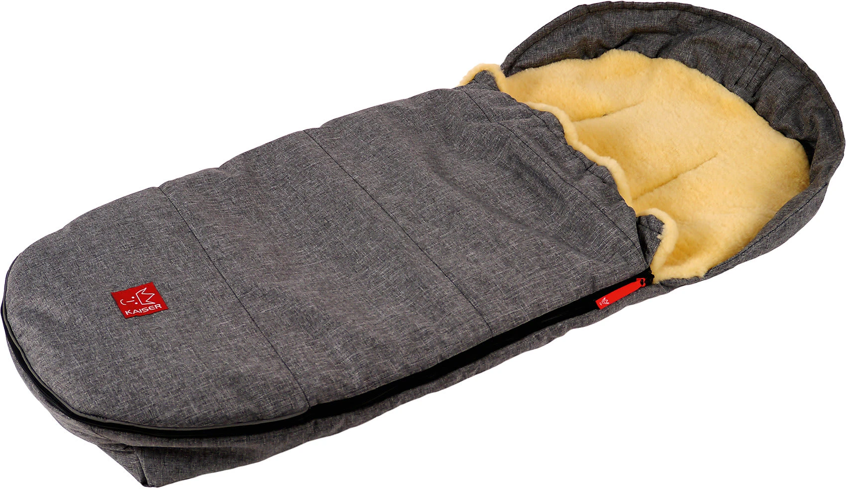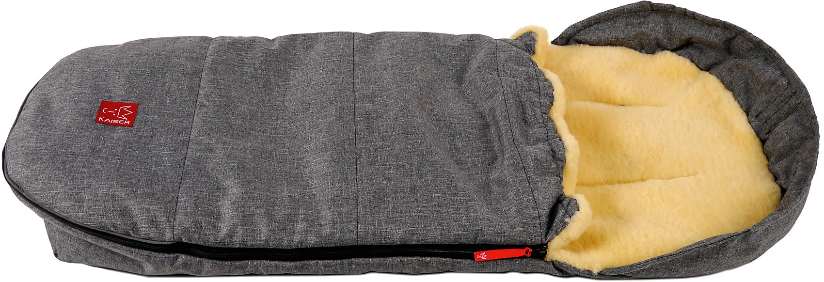 Die Detailsbilder zeigen den Fußsack in einer anderen Farbe. Zur Auslieferung kommt die Farbe anthrazit melange.