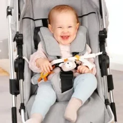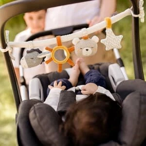 Mit der Kinderwagenkette aus dem fehnNATUR-Programm von Fehn sind Teddy und Esel bei jedem Ausflug dabei. Die Kette kann sowohl an der Babyschale als auch am Buggy befestigt werden. Kinderwagenkette von Fehn Teddy- und Esel-Anhänger mit Rassel, Raschelpapier, Spiegel Jersey, Strick, Nicki und Musselin, aus Bio-Baumwolle, waschbar ab Geburt geeignet Die Kinderwagenkette punktet mit weichen Textilien – komplett aus Bio-Baumwolle gefertigt – und sanften Farben. Im Mittelpunkt des Designs stehen die beiden niedlichen Stofftiere Bär und Esel, die auch bei anderen Artikeln der Kollektion die Hauptrolle spielen. Die Geräusche von Raschelpapier und Rassel animieren das Baby zu intensiver Beschäftigung. Außerdem bietet das Spielzeug einen kleinen Spiegel, in dem das Kind sich selbst sehen kann.